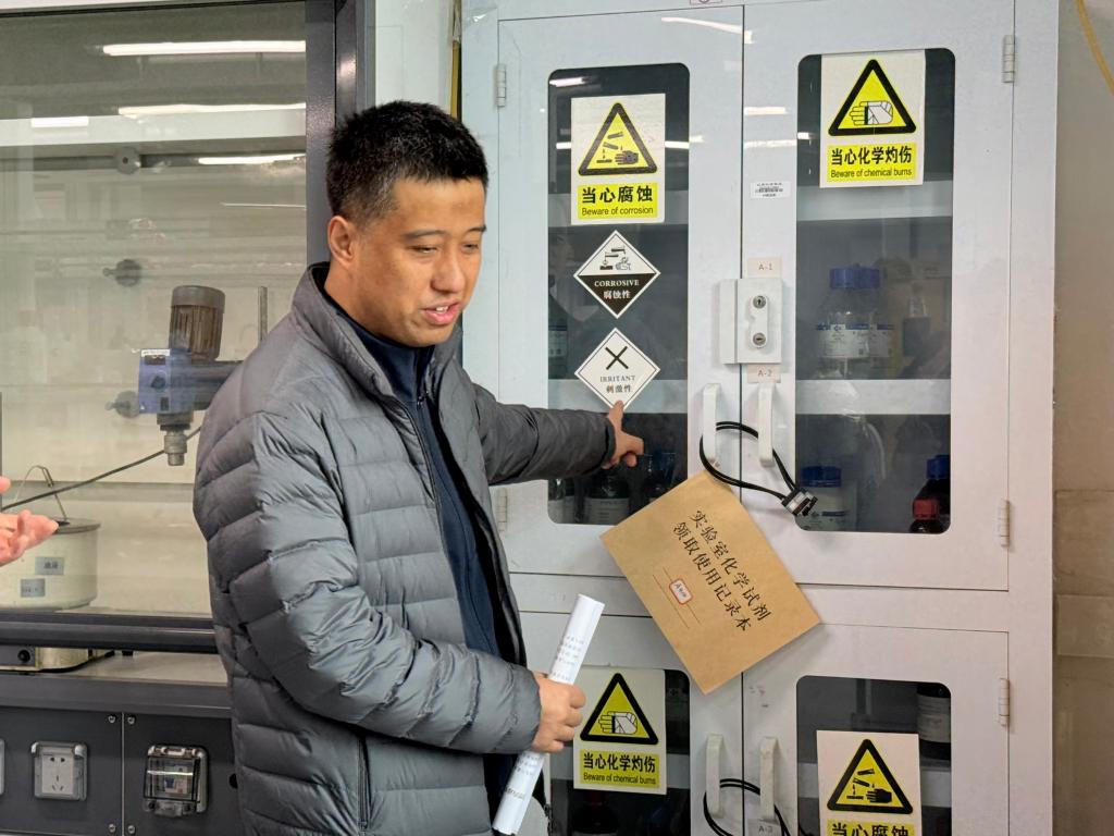 检查过程中,陆敏芝一行详细查看危险化学品台账、试剂储存条件、气瓶检验有效期与安全标识,现场核验设备运行状况与应急防护设施配备情况,对发现的隐患问题现场登记、现场交办,确保隐患整改即时响应、闭环管理。